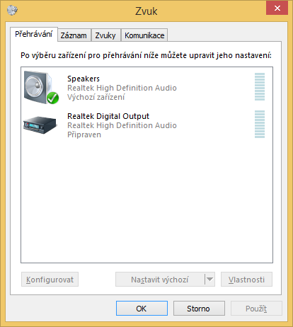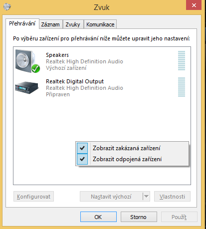 Zařízení tam máš. Proč se ti nezobrazují v nabídce přehrání netuším. W8 neznám, budeš muset počkat na někoho, kdo je ovládá.