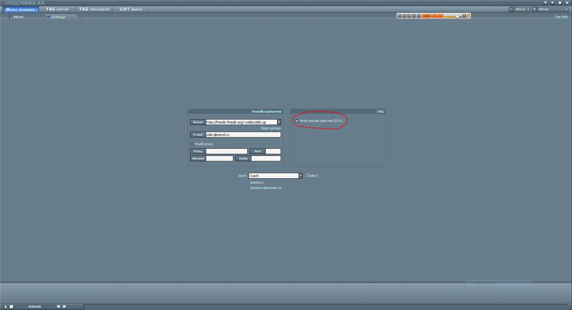 průbni v tom TagScanneru v nastavení zatrhnout položku "Write unicode data into ID3v2" co to udělá... pokud nic, tak by to měl umožňovat MP3Tag, viz tabulka "Write" TADY... jinak já sem rád že to hlavně hraje a zobrazuje potřebný tagy, stejně mám většinu času ten displej zhasnutej, pač to hrozně šajní