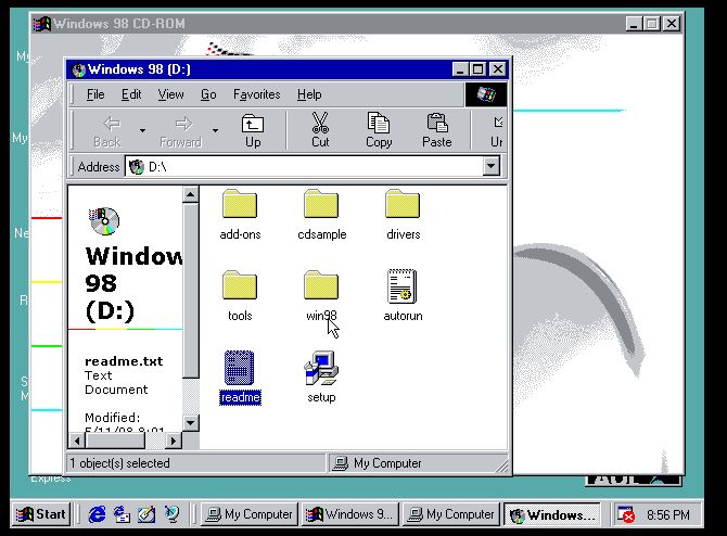 Rozjel jsem virtuální Win98 přes Vmware, ale bohužel se to tváří tak, že mám v mechanice zřejmě vloženo instalační CD Win98. Viz přiložený screen. Reálně je v mechanice to CD Jupiter.