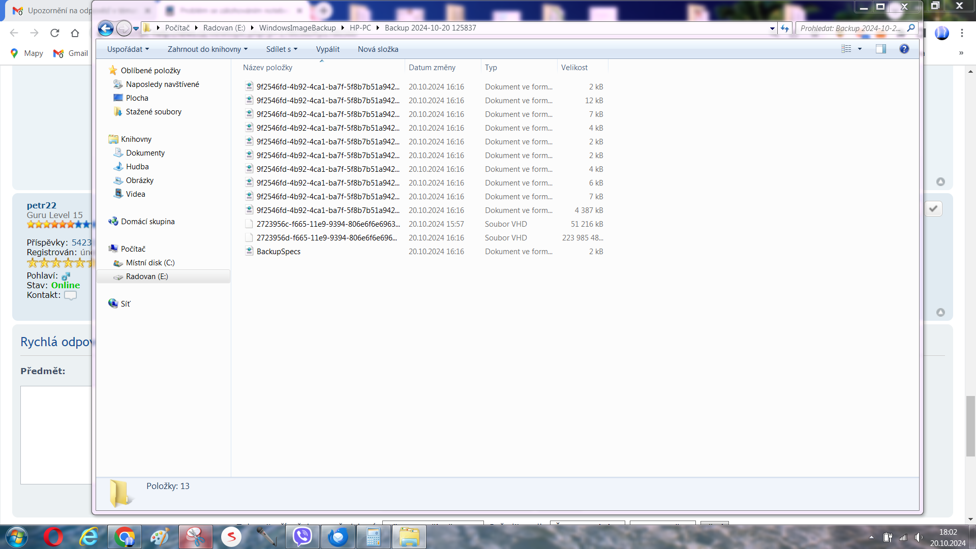 Tak to vůbec netuším co to může být. Složka Filmy Torrent má velikost 44,7 GB, WindowsImageBackup 213 GB a zbytek jsou zanedbatelné. Po rozkliknutí HP-PC se objeví okno viz příloha.