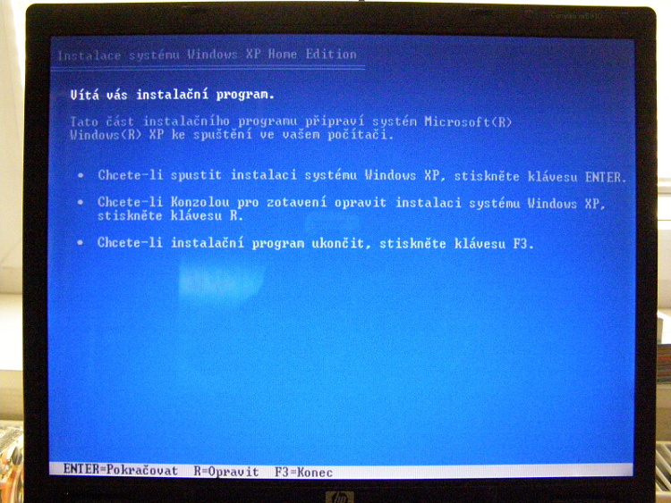 Když jsem zkusil instalační CD XP Professional tak po načtení instalačních souborů se nezobrazí nabídka jeslti chci instalaci nebo konzoli pro zotavení ale rovnou se mi ukáže kam chci Win instalovat, jsou tam už dvě partition tak jak má být - jedna je HP_RECOVERY, a ta druha ta hlavni se tvari jako ze neni zformatovana a je k dispozici plna kapacita pritom jsou na ni Win + data.