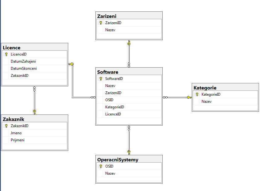 Dobrý den, dostali jsme jako semestrální práci vytvořit školní projekt na vybrané téma (Správa SW licencí). Takhle vypadá můj návrh tabulek, ale nejsem si moc jistý, zda by to tak mohlo být a chtěl bych poprosit zda vás, jestli vás nenapadá lepší návrh. Minimum jsou 4 tabulky a co nejméně redudantních dat.Děkuji.