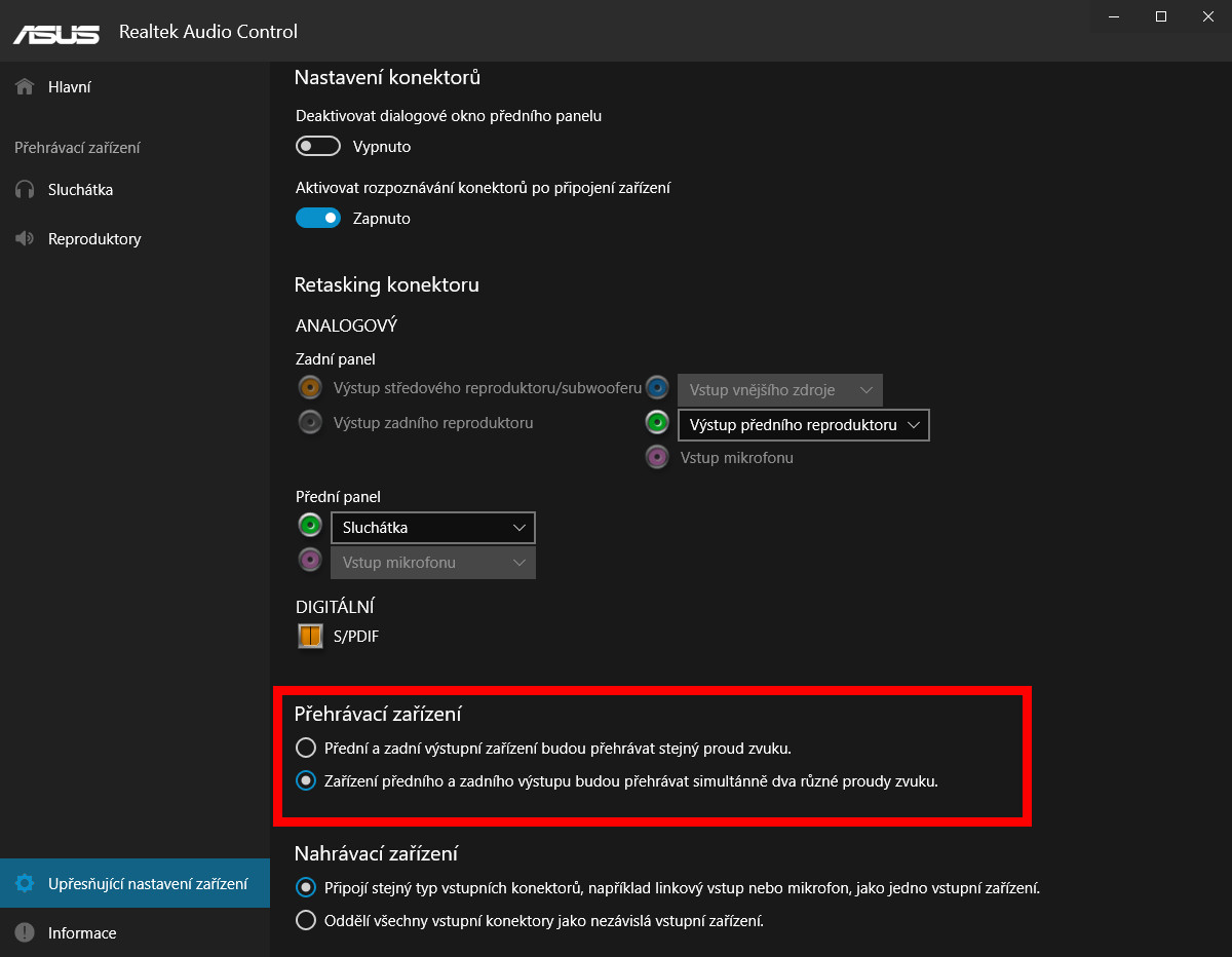 Jinak ano, automatickou detekci vypneš v aplikaci od Realtek. Je tam v nastavení používat obě zařízení/oba výstupy najednou nebo samostatně.