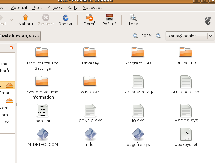 Takhle teď vidím z Linuxu část disku, na kterém mám WXP. Tedy tam je vidět všechno.