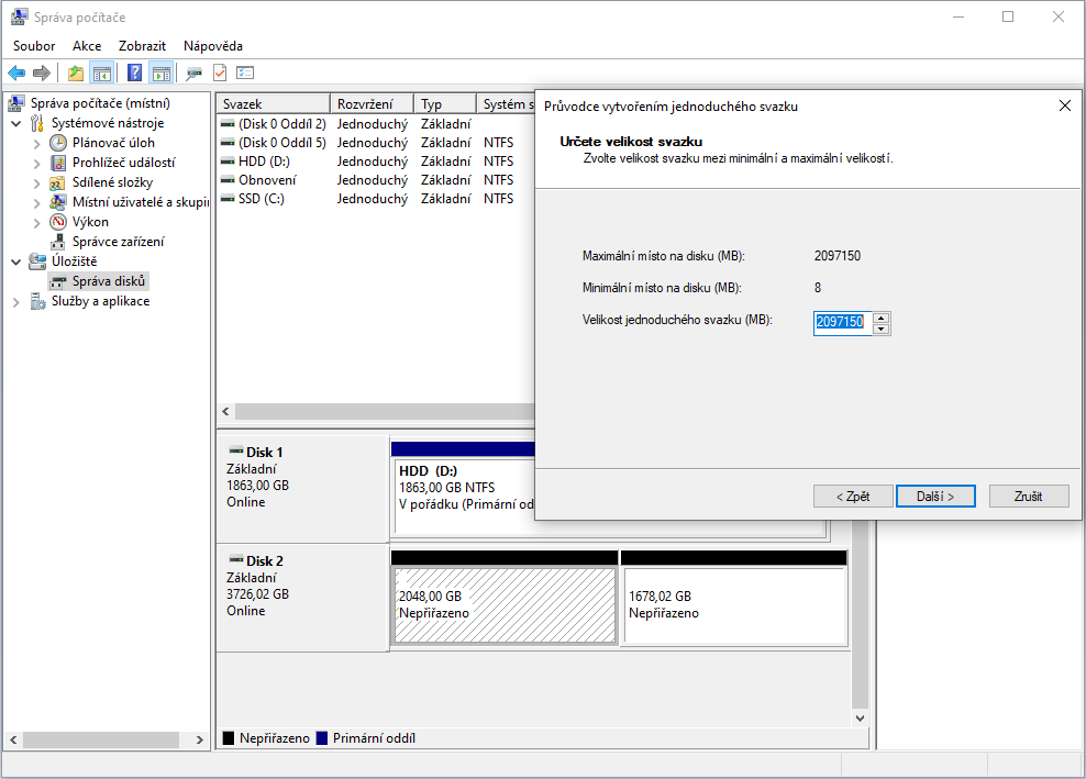 Disk se mi rozdělil na dvě části a přiřadit můžu pouze jednu... Při kliknutí na druhou část se mi nenabízí žádná možnost vytvoření svazku nebo odstranění.