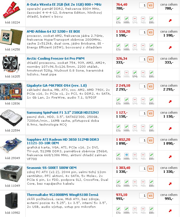 PS: Kamrád si kupoval MB, CPU a GPU od AMD/ATI druhý to samí, ale od Intelu/eNvidie. Toho kamaráda co měl AMD to stálo 10 000 toho druhýho 30 000, ale oba mělí skoro totožný výkon ve všech testech co dělaly. PC byl určený hlavně na hry. Výkon ve 3DMarku06 12 500 scodný - před 8 mesíci...