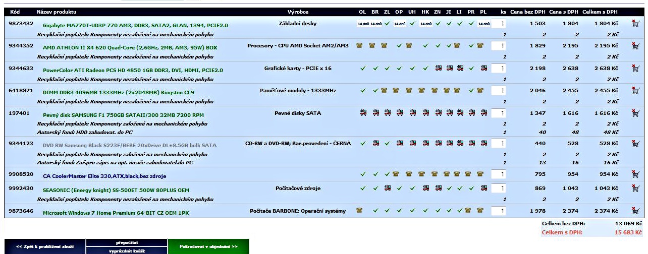 Ta sestava za 15 tisíc je ovšem bez operačního systému.Takže s ním by to bylo za 17 500,-kč.Ale zas má dobrou základní desku,kvalitní zdroj a lepší grafiku.Pokud chceš,tak ti něco sestavím na míru za 15 000,- i s Windows 7.Pak to jen hodíš do košíku a necháš si to postavit a poslat.Nebo vyber obchod v Olomouci a ať ti to složí tam.Třeba TS Bohemia tam tuším má prodejnu.