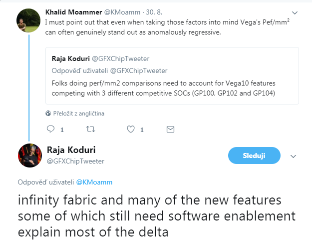 První várka recenzí podle Koduriho pořádně nepředvedla možnosti nastavení spotřeby/výkonu. Vega 10 je čip s největším rozsahem spotřeby/výkonu. Dle nějaké analýzi prodejů zjistili, že se většina lidí při koupi rozhoduje podle poměru cena/výkon, a tak byla spotřeba přesunuta na vedlejší kolej. Dělat si názor na architekturu Vega jen podle herní varianty je chybný pohled, protože Vega 10 má soupeřit s čipy GP100, GP102 a GP104, takže Vega 10 musí pokrýt servery, profesionální segment i herní segment. Na komentář, že ikdyž se vezme v potaz počet segmentů kde musí Vega 10 soupeřit, tak pořád má příšerný poměr výkon/mm2 Raja odpověděl, že Infinity Fabric ještě není plně aktivní a mnoho nových feature ještě není vůbec ani zapnuto. Infinity Fabric je optimalizována pro použití v serverech, ale dočkáme se i využití mimo servery (že by využití v APU Raven Ridge?).