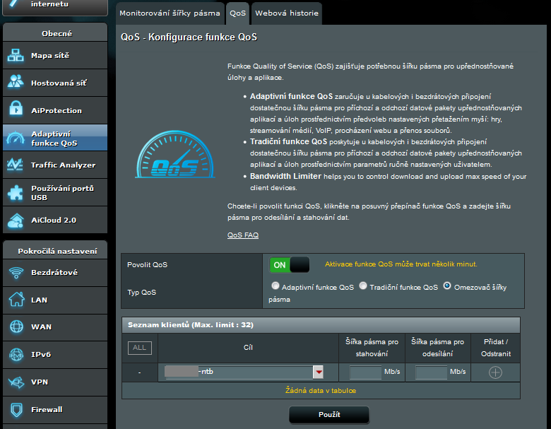 4. Omezení šířky pásma - lze přímo zvolit počítač, kterému bude šířka pásma omezena. A lze zvlášť nastavit jak download, tak upload. Je-li to aktualizovaná verze AC66U netuším. Původní AC66U mi rukama neprošel, takže tohle je dotaz spíše na výrobce.