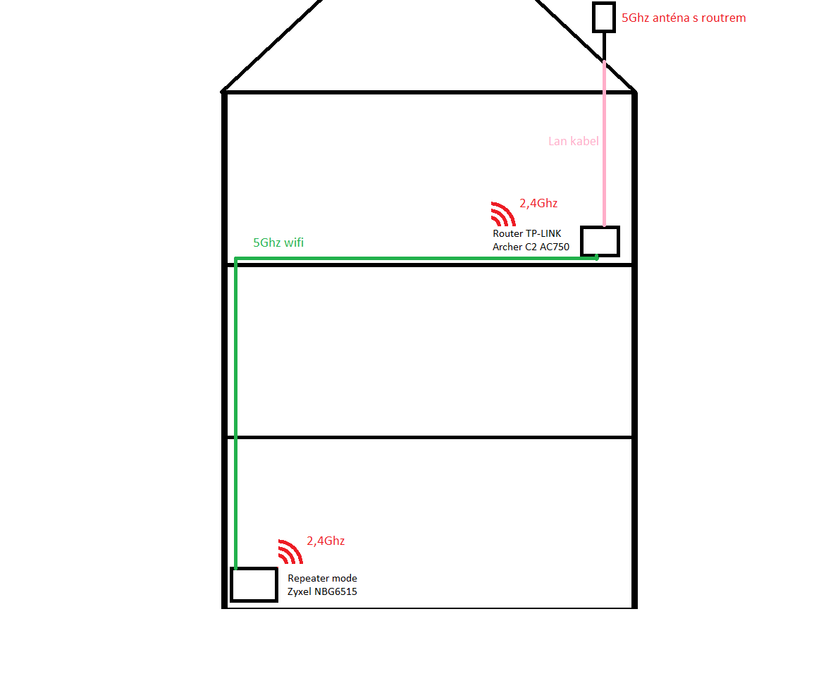 Ahoj, mám doma sít 54Mbit/s, která mě již nevyhovuje jelikož je pomala tak jsem se chtěl ohlídnout po něčem lepším zaujal mě router TP-LINK Archer C2 AC750 který má dvě antény kdy jedna pracuje na frekvenci 2,4Ghz a druhá na frekvenci 5Ghz a napadlo mě že bych 2.4Ghz anténu využil pro běžná wifi zařízení a 5Ghz pro Repeater/Range Extender akorát jsem nevím jaký vybrat Repeater/Range Extender, který by přijímal 5Ghz a vysílal 2.4Ghz