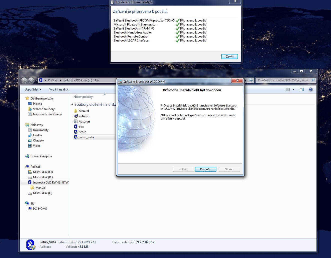 Jinak mám doma ještě jeden USB Bluetooth dogle od Asusu, zkusil jsem nainstalovat i ten. Stáho ovladač pro win 7 64 bit přímo ze stránky asusu. Nainstaloval, vše proběhlo jak má, jak je vidět na fotce. V liště vpravo dole svítí modrá ikona Bluetooth a když kliknu na vyhledat zařízení, tak vůbec nic nenajde..kde může být problém zde ?