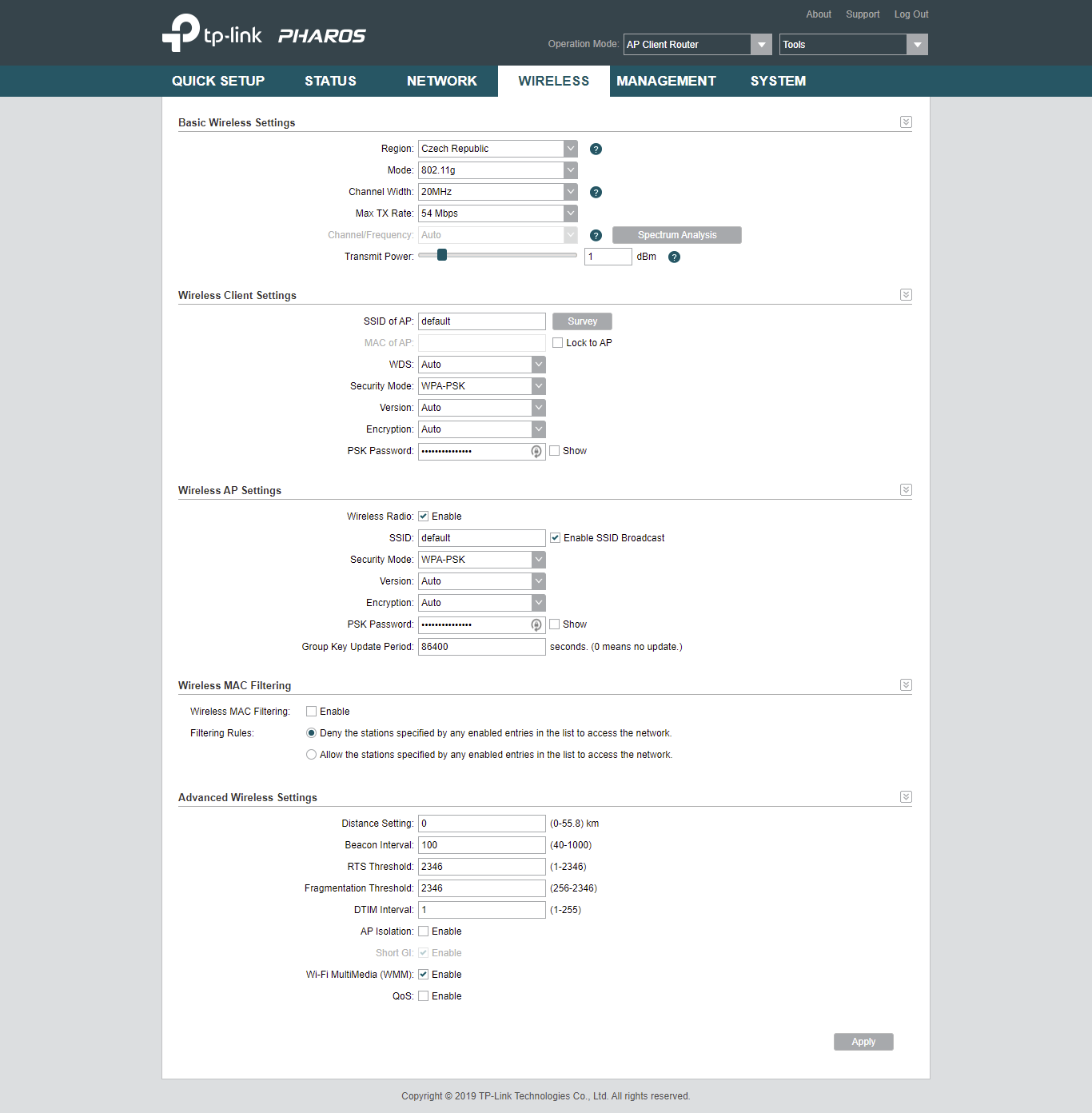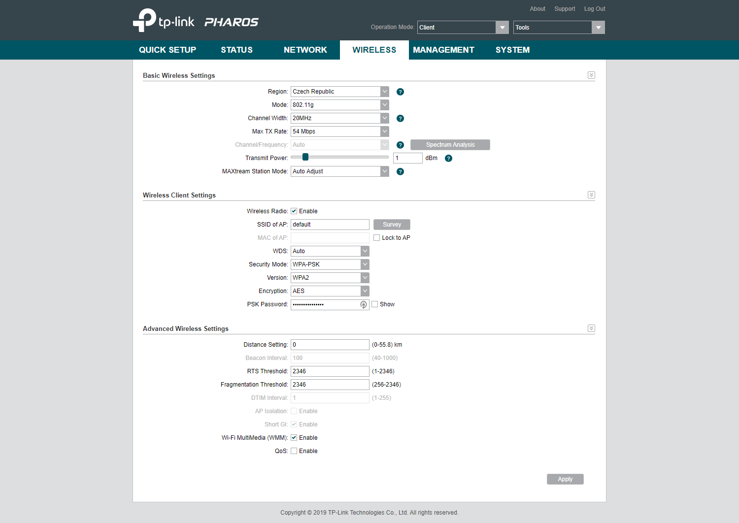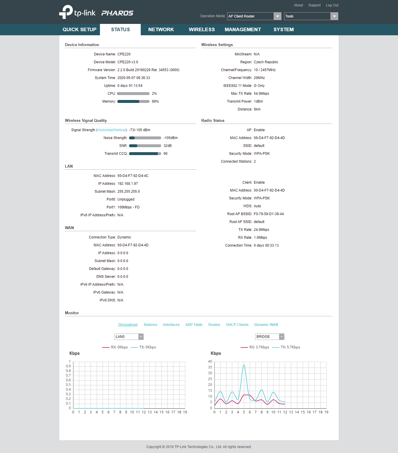 Na Client Router se mi nepodarilo internet rozchodit. Prepnul jsem to na Repeater a jede to. Nejdriv byl internet pres wifi z CPE220 polovicni rychlosti a pres kabel jel na plno. Prepl jsem na 802.11a g n z puvodniho 802.1g na obou CPE a sirku kanalu z 20 na 20/40MHz. Ted to jede jak ma.