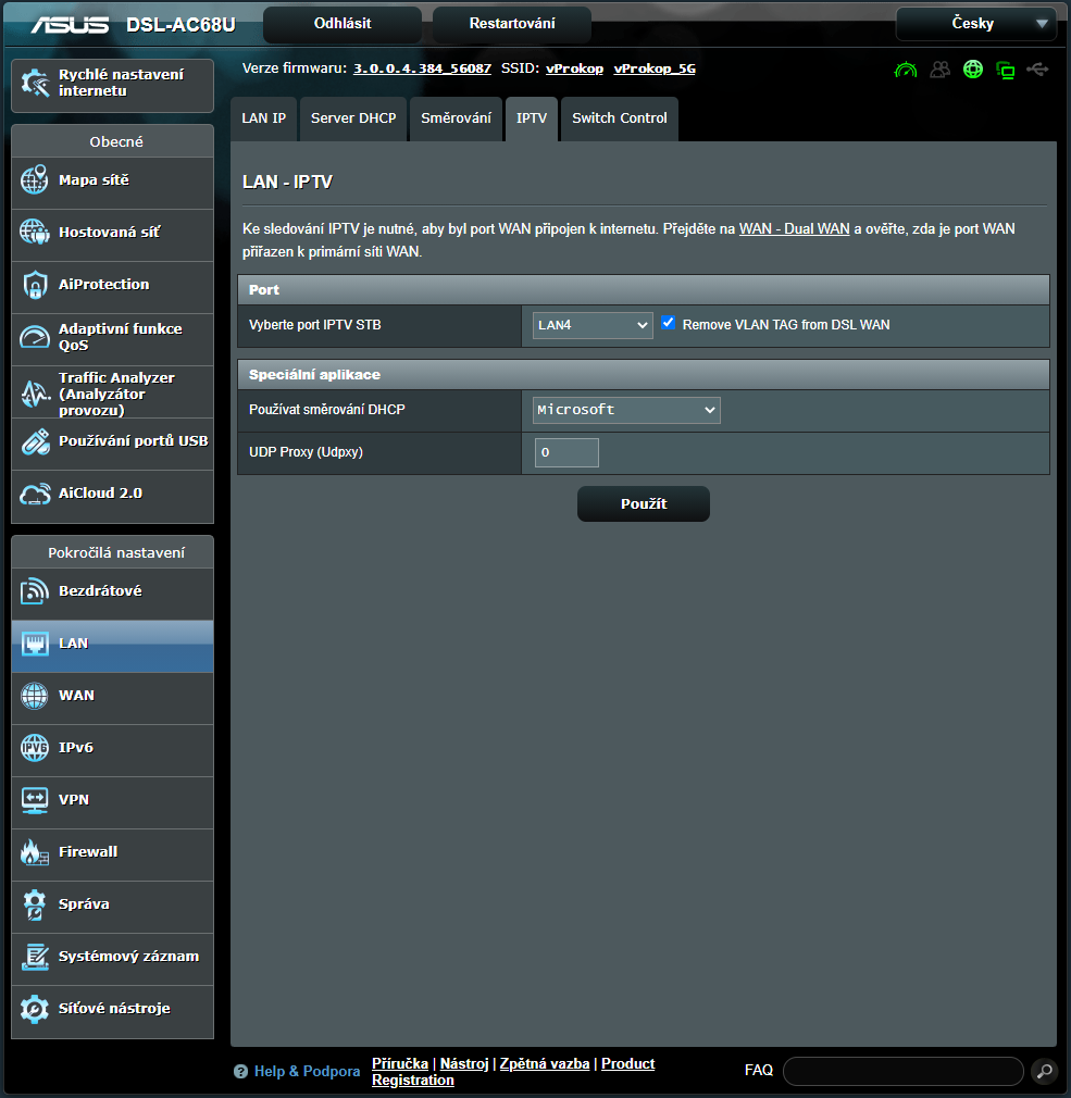 rad bych se zeptal, zda-li by mi nekdo byl schopny poradit s nastavenim O2TV pres VLAN na tomto routeru. Sel jsem podle navodu (vicemene), nicmene nektere polozky zminene v navodu na mem zarizeni nejsou. Tak ci tak, pouzil jsem tento navod: https://www.asus.com/cz/support/FAQ/1043266/