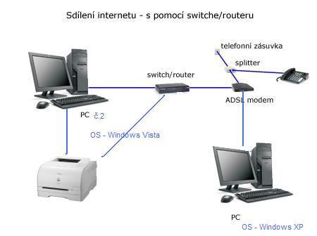 PC č.1 - poněkud starý, ale stále provozuschopný počítač s OS Windows XP, k tomu je přímo napojený modem/router Huawei EchoLife HG520i od O2 (a na telefon) - následně je to kabelem prodloužené přes starý switch Repotec 8-P Web Smart Switch dalším kabelem ke druhému už novějšímu PC č.2 s OS Windows Vista.