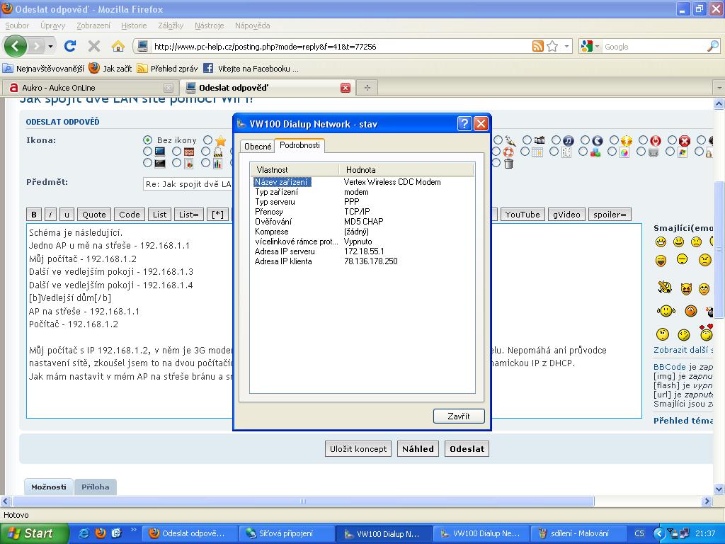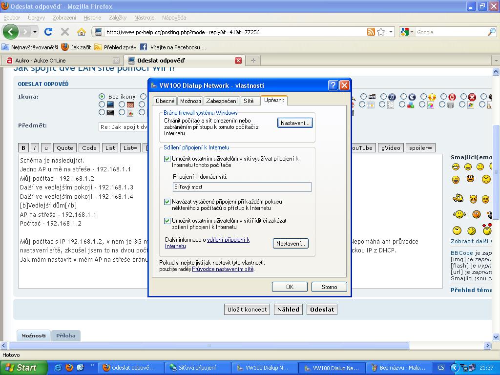 Výborně, podařilo se mi spojit obě stanice a zkušebně zkopírovat soubor. Sdílení dat tedy funguje. Zbývá nastavit sdílení internetu, ale to mi nejde ani po kabelu.... Používám 3G USB modem, vše je nastaveno pro sdílení a nejde to.... Musím použít nějakou spešl IP adresu? Používám klasický 192.168.1.x