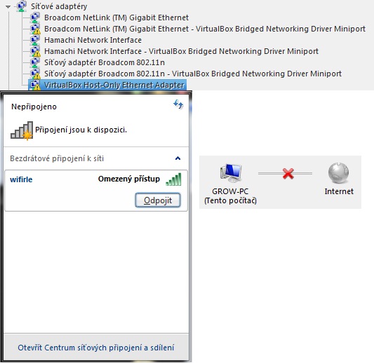 Tak tak, a taky nemáš nemáš ve správci samé vykřičníky, ale jen ti nějak havaroval Virtualbox bridged networking driver miniport. Zkus si najít na netu ovladač pro Tvůj ntb a OS a pokus se o opravu.