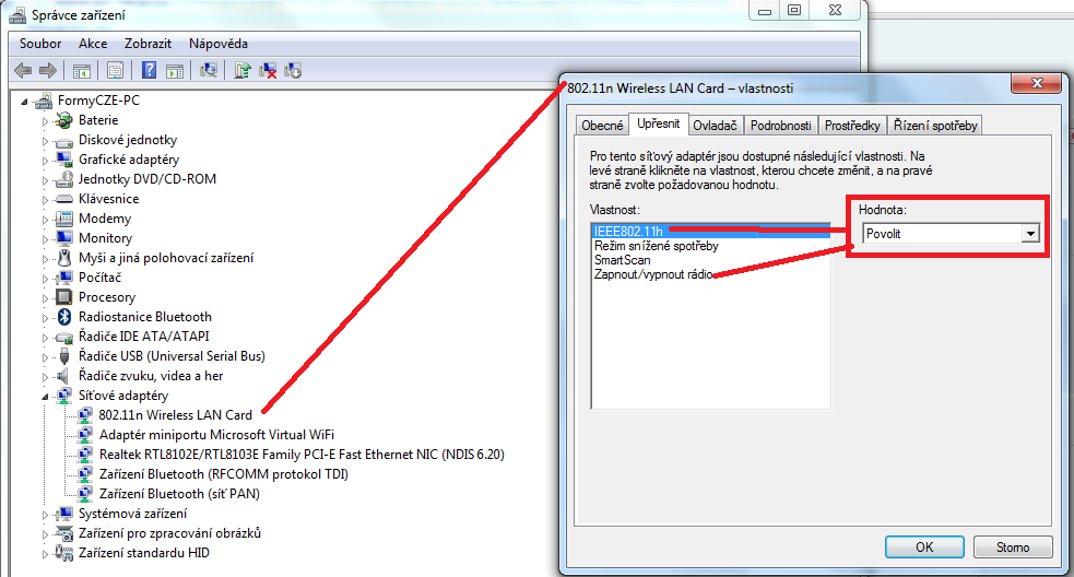 Běž do správce zařízení, otevři síťové karty, 2x klikni na 802.11n Wireless LAN Card, upřesnit a nastav si to podle obrázku.