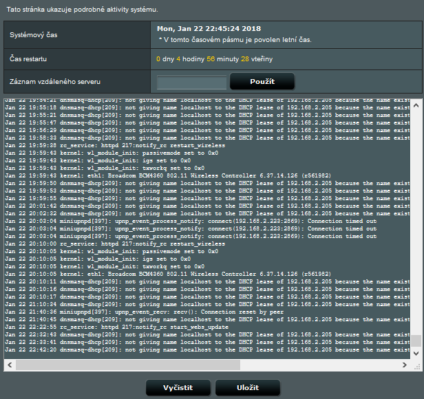Ještě mě tak napadlo, nemyslíš, ze by ti nemohl pomoci systémový záznam toho routeru? Je tam třeba věc která mě tak zaujala a to "dnsmasq-dhcp[209]: not giving name localhost to the DHCP lease of 192.168.2.205 because the name exists in /etc/hosts with address 127.0.0.1", která se opakuje poměrně často