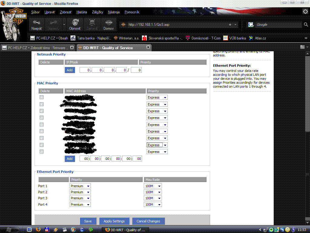 Trochu som nastavoval QoS. Môže to byť takto? Ide mi o to aby všetky tie Mac adresy mali pri pripojení rovnaký podiel na celkovej rýchlosti. Ak bude k netu pripojený iba jeden užívateľ, nech mu to ide naplno koťko mu dá poskytovateľ, ale ak tam budeme dvaja alebo viacerý, tak nech sa ten prenos delí spravodlivo pre všetkých. Viď screeny.