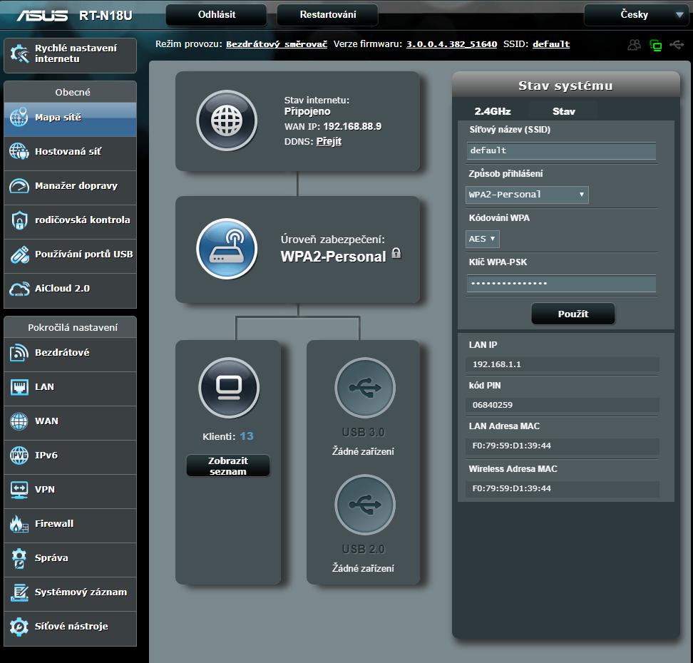 Nevim, jestli je to dulezite, ale do site pres kabel je zapojeno cca 5 zarizeni a na wifi cca 10 zarizeni (hlavne venku).