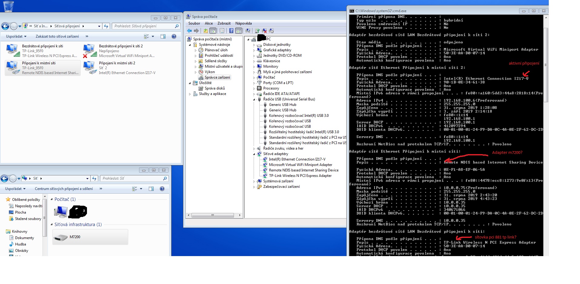 Je určen pro stolní PC (což není asi ideální) propojení routeru je skrze USB kabel. Ve správci zařízení je v síťových adaptérech nainstalován jako Remote NDIS Based Internet Sharing Device, DHCP a DNS je nastaveno automaticky. Po odpojení USB se identifikuje jako virtual wifi miniport adapter. Dále je v pc síťová karta TP-LINK TL-WN881ND (i s inst. CD), Dále Ethernetové připojení přes optiku (momentálně aktivní)