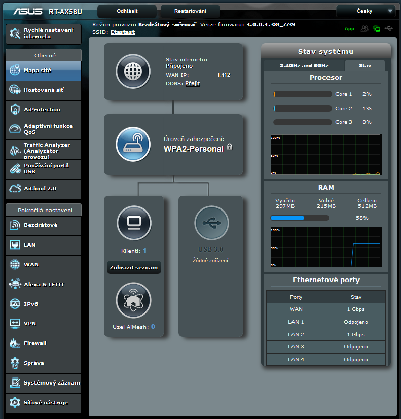 Mapa sítě Po přihlášení k routeru se zobrazí stránka, kde najdete aktuální informace o zatížení procesoru, připojených klientech, obsazených portech, připojeném USB, atd: