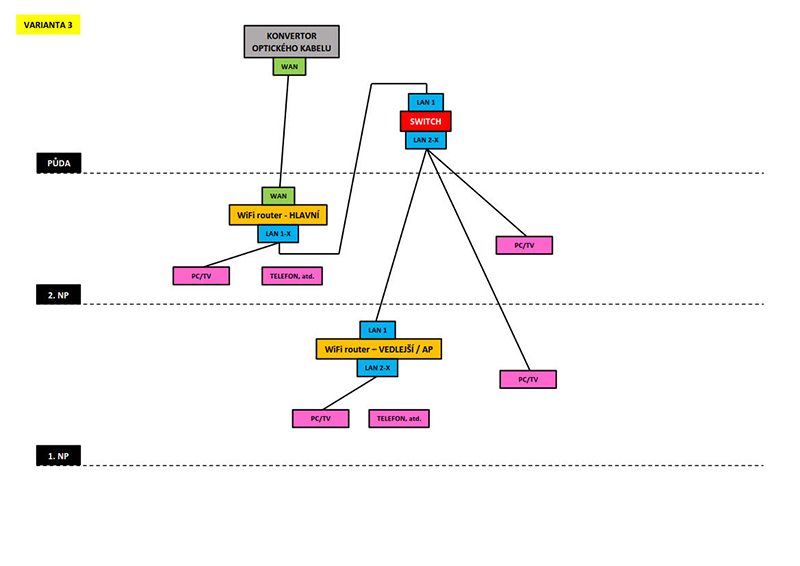 Díky za rady a připomínky, už jsem se v tom zorientoval a vídím, že varianta 2 takto nelze. Zvážím reogranizaci kabeláže po domě a rozhodnu se pro variantu 1 nebo 3. Mám obavy, aby z půdy byl dostatečný signál pro 2. NP.