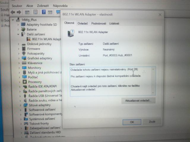 Mam na cestach notebook obycejny Visionbook 14Wg Plus. Uz jednou jsem mela problem s ovladaci u wi-fi musela jsem tehdy dat pocitac do tovarniho nastaveni, smazat oba ovladace a pak se jeden chytl. Kdykoliv to blblo delala jsem to tak, ze jsem ve Spravci zarizeni - sitove adaptery - zobrazila skryte zarizeni a oba ovladace (vzdy kdyz to blblo byly dva misto 1) odinstalovala, pak jsem restartovala a vse slo (pocitac si sam priradil spravny ovladac). Predevcirem mi ale prestala jit wi-fi. Kdyz jsem odinstalovala a restartovala uz ovladace nebyly zadne. V dalsich zarizeni je vykricnik u 802.11n WLAN Adapter (po rozkliknuti kod chyby 28, chybi ovladace). Ovladac na wifi ale mam.