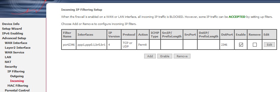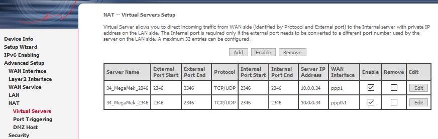 Port Foward není Virtual Server, niceméně pro tento účel dělá správně a tento způsob by měl být funkční. Pro tvoje požadavky, je to prakticky stejné. Nicméně mám takové tušení, že firewall na Comtrendu ani není povolený, vzhledem k tomu, že po IPv6 to funguje a pravidlo pro Ipv6 není.