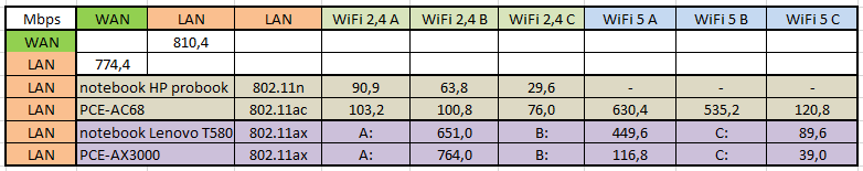 Systémový záznam: Zde lze nalézt další logy z provozu routeru. Síťové nástroje: Router umí ping, tracert. A komu nestačilo nastavení WiFi, může se i zde vyřádit, tedy pouze pokud má povolenu smart WiFi. Testování: router jsem podrobil standardním testům. Test WAN/LAN nasdílen disk a měřeny reálná rychlost kopírováním velkého souboru. Testy WiFi byly LAN->WiFi, opět nasdílen disk a měřeno kopírováním velkého souboru. Jako "měřidlo" byl použit totalcommander. Vzdálenost "A" = 1m od routeru, vzdálenost "B" 5m od routeru přes jednu panelovou zeď, vzdálenost "C" 9m od routeru přes tři panelové zdi. Router byl testován v režimu WiFi6 s ntb Lenovo a se síťovou kartou Asus PCE-AX3000. V režimu ac se síťovou kartou ASUS PCE-AC68. V režimu WiFi4 s notebookem HP Probook. Testy probíhaly v normálním panelovém domě, v okolí 32 WiFi sítí.Pro představu přikládám i screen z programu InSSIDer:A konečně stav sítě - navázaná rychlost WiFi s kartou AX3000: Občas se zde objeví i dotaz na spotřebu. Při běžném provozu (1x zařízení na LAN, 3x na WiFi) naměřen příkon 6,8W. Měřeno měřičem Geti GPM01.
