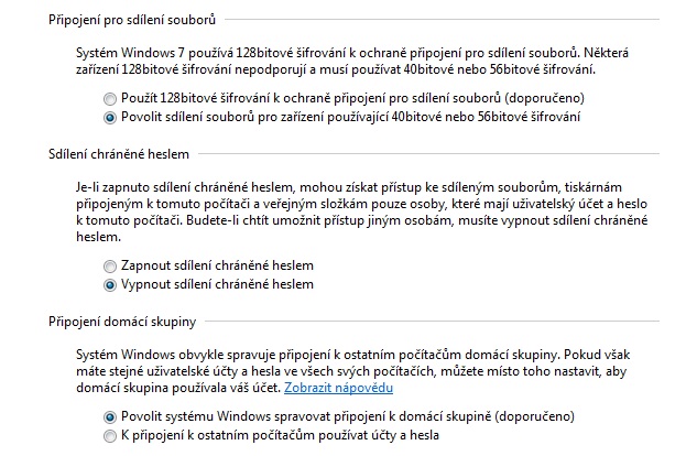 Kdyby nic tak vlez do centra síťových připojení a sdílení a vpravo nahoře klikni na "Změnit pokročilé nastavení sdílení" a tam to nastav takto: