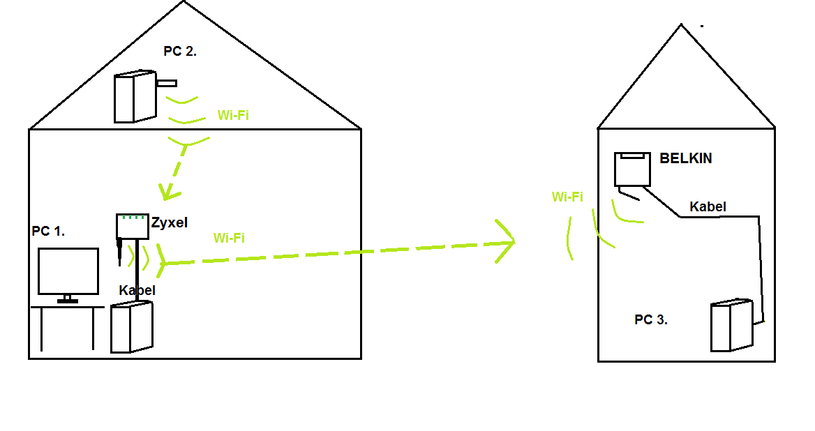 Prvni pocitac je pripojeny kabelem k routeru Zyxel (p660HW-T3 v2 s novym firmwarem) a navic ten router siri internet prez wifi.Druhy pocitac je v podkrovy kde mam usb wifi adapter- na obou pocitacich vsechno jede a sou na nich sedmicky.A ted se dostanu ke tretimu pocitaci, ten mam v dilne a mam takovy plan ze k tomu pocitaci prez kabel pripojim ten BELKIN (G wireless router f5d7230-4) a BELKINA nastavim na wifi kterou siri Zyxel .viz obrazek