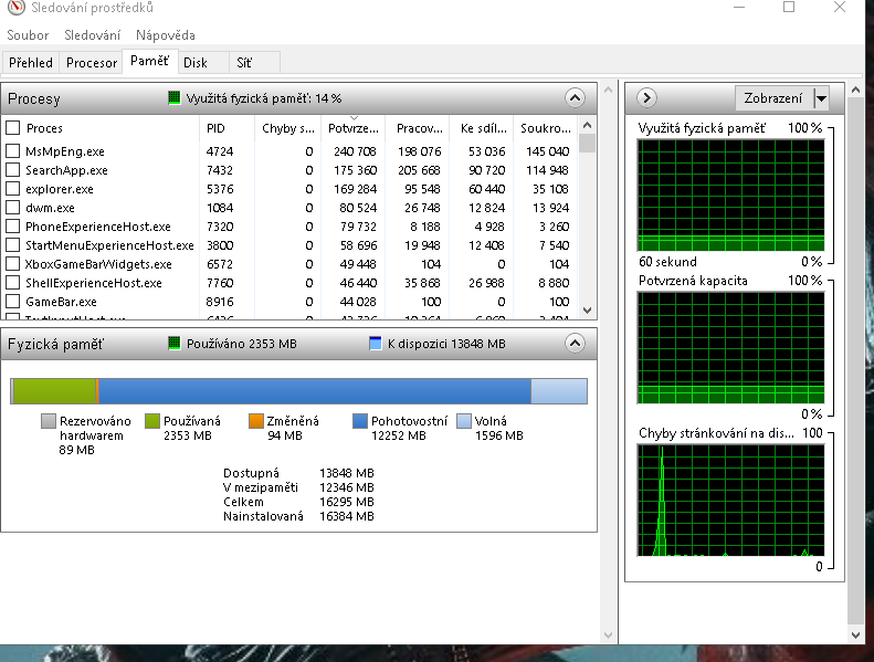 Zdravím potreboval by som poradiť. Od včera mi padajú hry ale i Chrome vždy z hláškou nedostatok pamäte. Chrome mi nenačíta stránky alebo mi rovno padne celý obraz. Prehliadač udalostí v ten moment hlási chybu Systém Windows úspěšně diagnostikoval stav nedostatku virtuální paměti. Nejvíce virtuální paměti spotřebovaly tyto programy: Diagnostics.exe (7436) – spotřebováno 2491908096 bajtů, chrome.exe (9776) – spotřebováno 340656128 bajtů a MsMpEng.exe (4168) – spotřebováno 303869952 bajtů. Mám 16 GB ram takže nechápem. Neviete čím by to mohlo byť ?