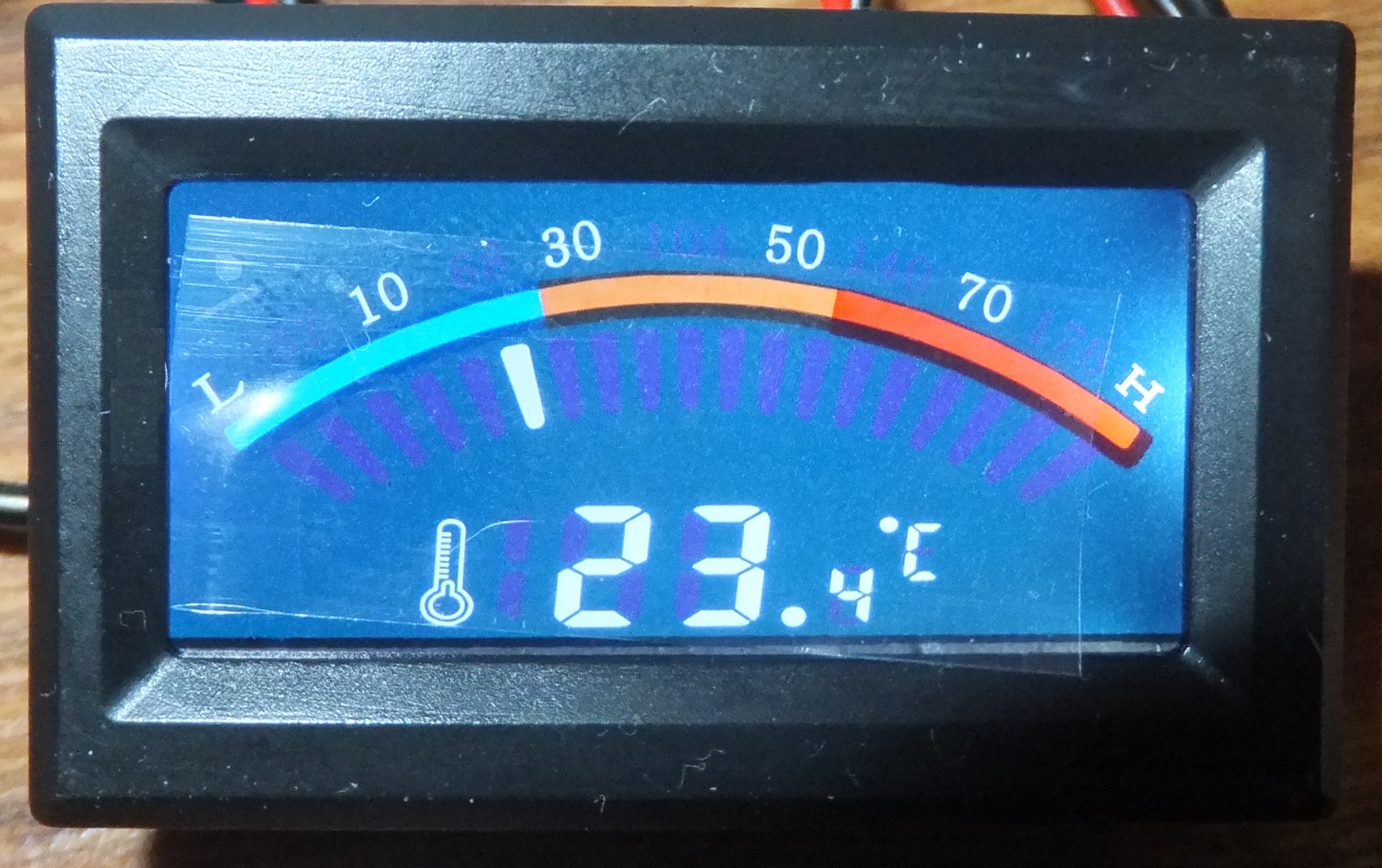 Do skříně za 174Kč. Čidlo spojené dlouhým kabelem, na molex (jak samice, tak samec). Přepínaní mezi °F a °C na druhé straně pomocí tlačítka (mezi stupnicemi, které svítí jsou zhaslé °F, ty se po zmáčknutí ihned rozsvítí, vypadá to fakt hezky). Velikost je sice 5x3cm, ale displej je nádherně ostrý a jasný, však se stačí podívat na foto.