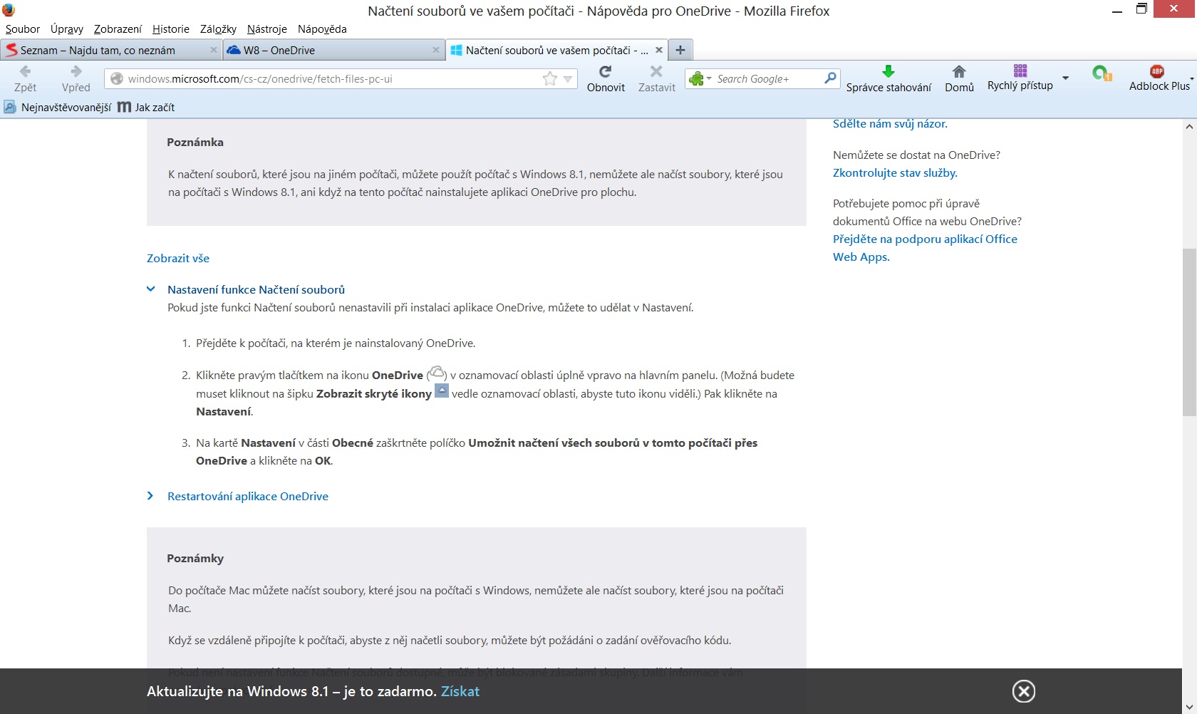 Dobrý den. Nedaří se mi připojit k PC přes OneDrive. Ikonku na liště dole na PC nemám, není ani skrytá. Prosím o radu, kde je asi chyba. Mám WIN8, Mozilla Firefox.