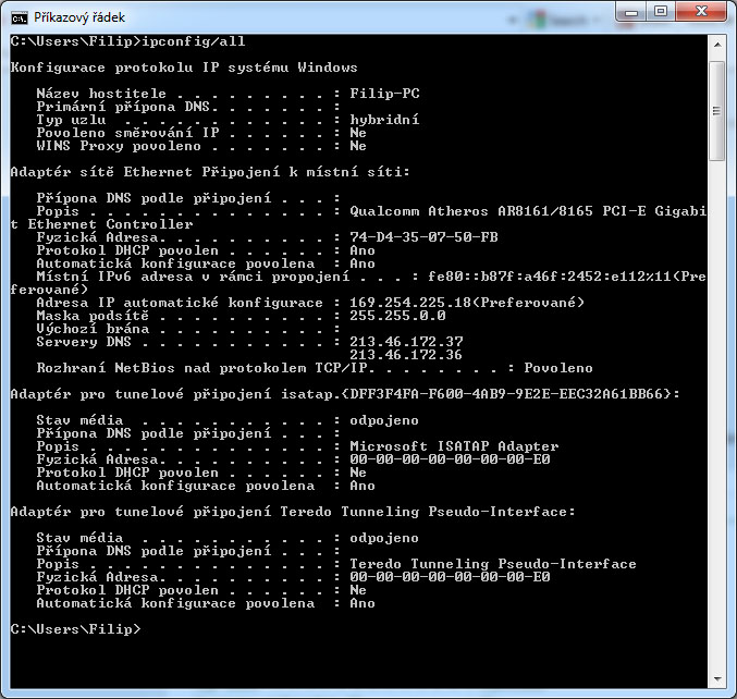 Zkusil sem udělat základní diagnostiku a IP adresa začíná 169.*.*.* a výchozí brána tam není, takže někde musí být problém, ale když spustím Win z jiného HDD, tak to jde normálně, takže chyba musí být někde ve Windowsech...