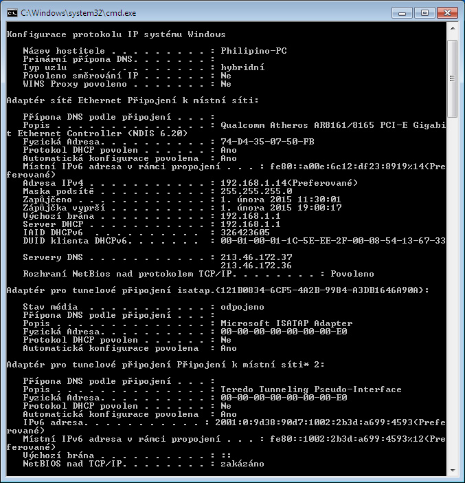 OK. dej sem ipconfig /all z těch windows, které fungují.