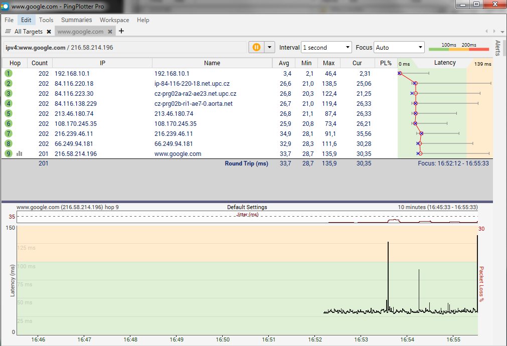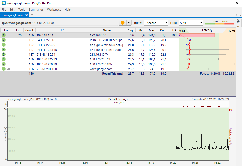 Druhý obrázek je naprosto bez chyb na tvé síti. Nicméně na připojení kabelem jsou odezvy opravdu vysoké, ten skok na 84.116.220.18 je opravdu neobvyklý, screen pošli providerovi. Jak můžeš vidět v diagnostice sítě (můj podpis) odezvy na kabelu by měly být poloviční. Nicméně - je to upc - zkus totéž při vypnuté(tých) TV, zda se odezvy změní.