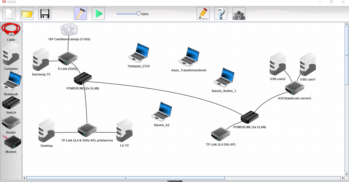 Přikládám screen s prvním pokusem o zachycení sítě ve Filiusu. Už jen to, že klienta od ISP a powerline musím simulovat jako switch, mobily jako notebooky, TV a webkamery jako desktopy a ještě k tomu Filius neumí bezdrátové připojení, mě pěkně štve.