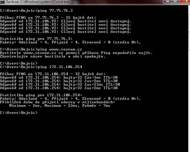 Asi bych s tím zašel za správcem vaší sítě. Ty máš totiž přístup na jejich hlavní výchozí router ale ten tě jakoby nepustí dál. A ani nedokáže přeložit doménu (www.seznam.cz) na IP (77.757.6.3)