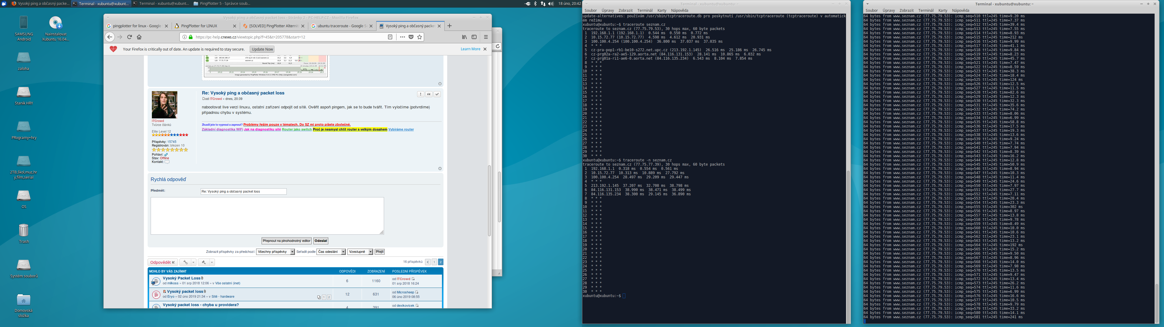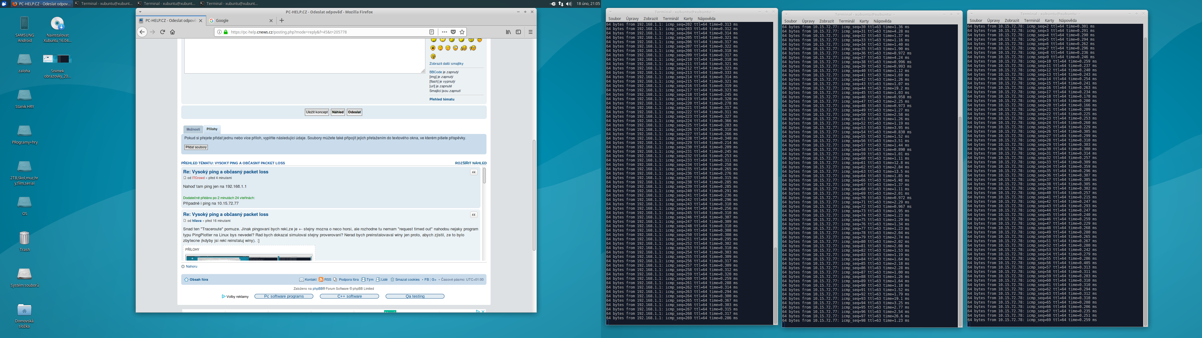 Paradoxně ten ping je stejný (tzn ping kolem 5-6 s vystřelením k 20-40 jednou za čas, bez timed request), ale pingplotter má 94% na 192.168.1.1 -_- myslím si, že si permoníci dělají ze mě prdel. Zkouknu to zítra kolem 17:00, kdo ví jestli teďka nemám lepší cestu, když všichni šli spát nebo jestli krásná, vlahá noc s hvězdami je pro můj internet to nejlepší.ITCrowd píše:Tak vidíš sám, že linux je v pořádku. Zkus to ještě ověřit pingem ve woknech, měl by být vidět rozdíl.