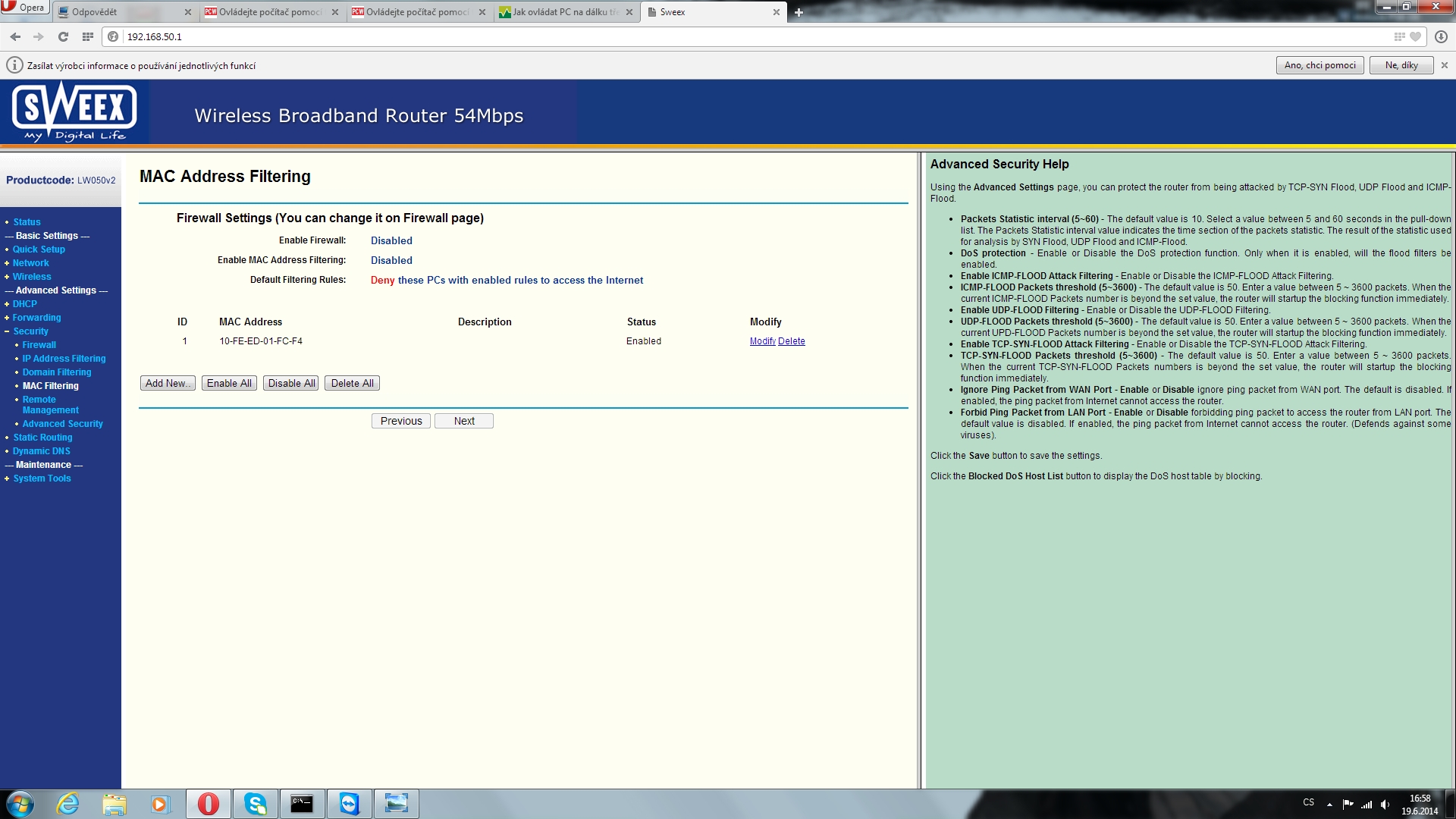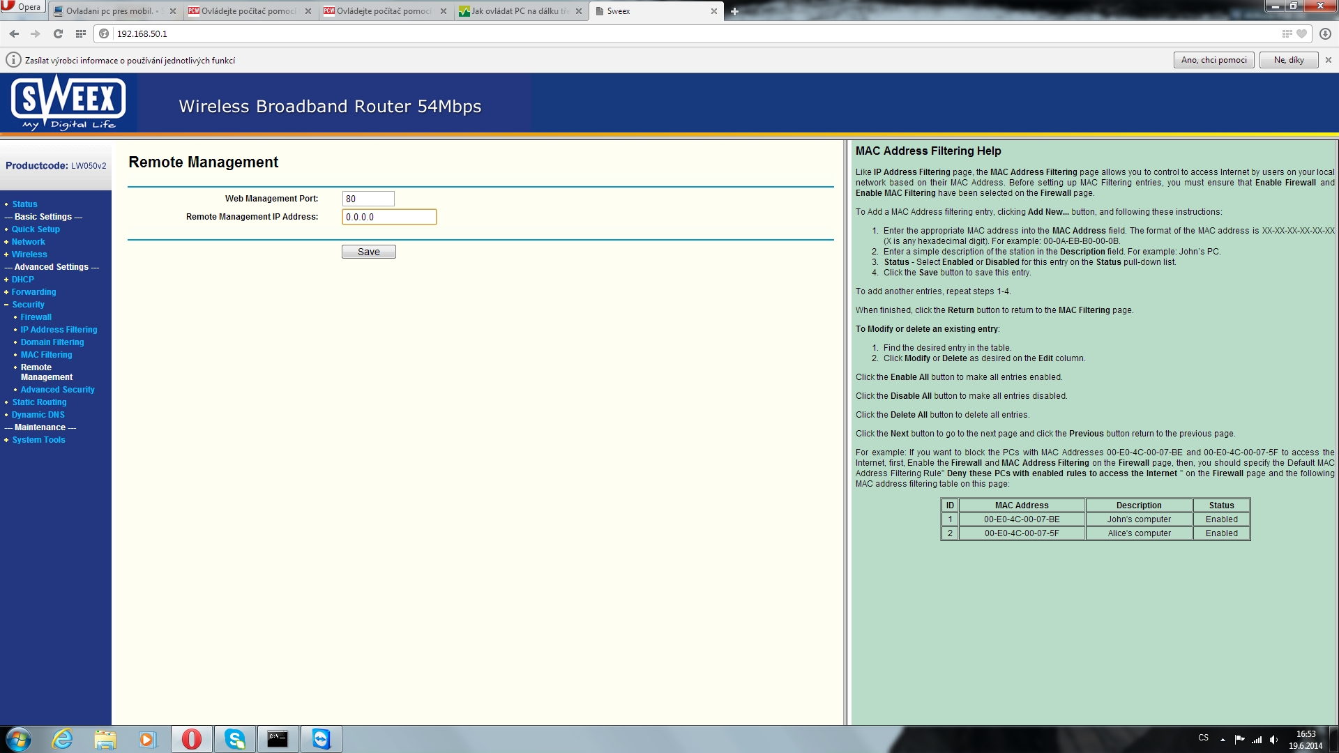 Dostal jsem se sem, zadal jsem IP adresu do routeru. A tady jsem zadal MAC adresu od ethernet portu. A tady jsem nasel nejaku sekci Remote, podle nazvu me to nejak zaujalo.