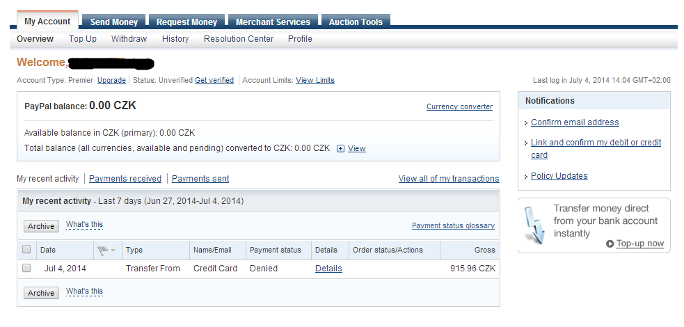 Dneska jsem chtěl zaplatit přes PayPal na USD,ale na tom nezáleži,bylo to asi 880kč. Dal jsem zaplatit hodilo mi to PayPal a přes něj jsem platil poprvé,tak jsem tam zadal zapltit (okamžitě)+ udaje karty (účet jsem tam už měl) ale neověřený... dal jsem pokračovat a "Pay now". Vyskočila tam chyba něco s tím,že banka odmítla MasterCard nebo tak něco,to bych bral. Dojdu na účet ČSOB a tam Aktualně - 915kč a disponibilní 835 (80kč+-) se odečetlo.