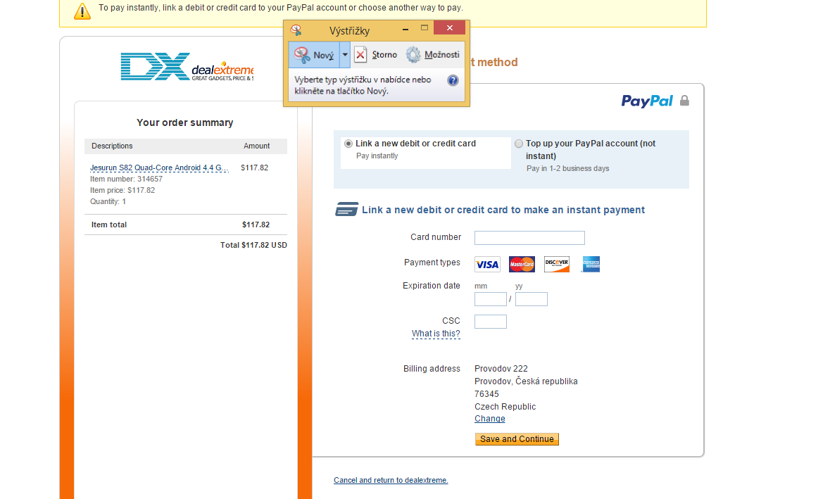 Chci si koupit jednu věc na dx.com a když dám že chci zaplatit paypalem ,tak mě to hodí ať se přihlásím ok , potom to po mě chce abych si to spojil s kreditní kartou nebo tam poslal peníze , ale nikde mi neháže že tam mám míň peněz mám tam 3058 kč a objednávka stojí 117 usd ( 3027 kč) no a stejnak to nejde