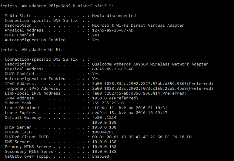Připoj se doma k síti, po minutce spusť příkazový řádek Windows, zadej do něj příkaz ipconfig /all a potvrď.