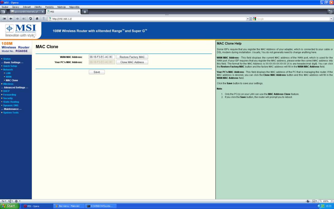 Na WAN bude něco jako klonovat MAC adresu a mod nechej na Dynamic IP. Popřípadě tu hoď screeny z nastavení