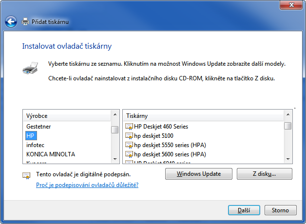 Pak postupuješ přidat tiskárnu / místní / vybereš model HP a nějaký deskjet (inkoustovka) třeba ten hp deskjet 460 series. Vytiskneš zkušební stránku. Funguje - hurá. Nefunguje - odstranit tiskárnu. A znovu: přidat tiskárnu / místní / vybereš model HP a jiný deskjet (inkoustovka). Vytiskneš zkušební stránku. A pořád dokola. Pokud se žádný ovladač nechatí, pak máš smůlu. Ze zkušenosti ale vím, že se nějaký chytne.