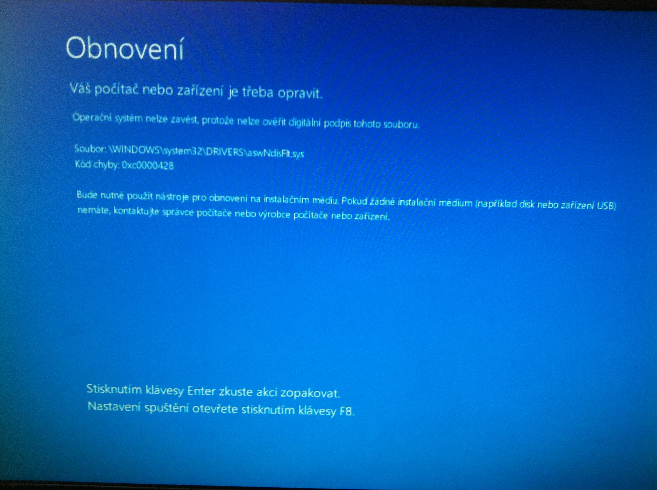 Ahoj, včera večer jsem na svůj PC s win 10 nainstaloval Avast!, instalace proběhla v pořádku ale dnes ráno když jsem PC zapnul mi to vyhodilo modrou obrazovku (ne BSOD) viz fotka. Klávesnice vůbec nereaguje na stisknutí klávesy F8 nebo Enter, chtěl sem se dostat alespoň do Biosu, ale klávesnice prostě nereaguje, vyzkoušel jsem celkem 3, z toho jedna byla zapojená přes PS2, ani jedna nereaguje, vždycky jen na začátku problikne, a to je vše( přodtím fungovali normálně. Vzhledem k tomu že jsem win 10 stáhl ještě jako BETA verzi z oficiální stránek Microsoftu nemohu do PC vložit žádný disk nebo flashku aby si to windows opravil sám. Nevíte někdo jak tuto chybu opravit? Děkuji