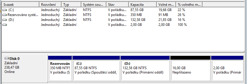 Viz. příloha - disk0 jedna primární, jedna rozšířená partition a v ní dva logické disky.