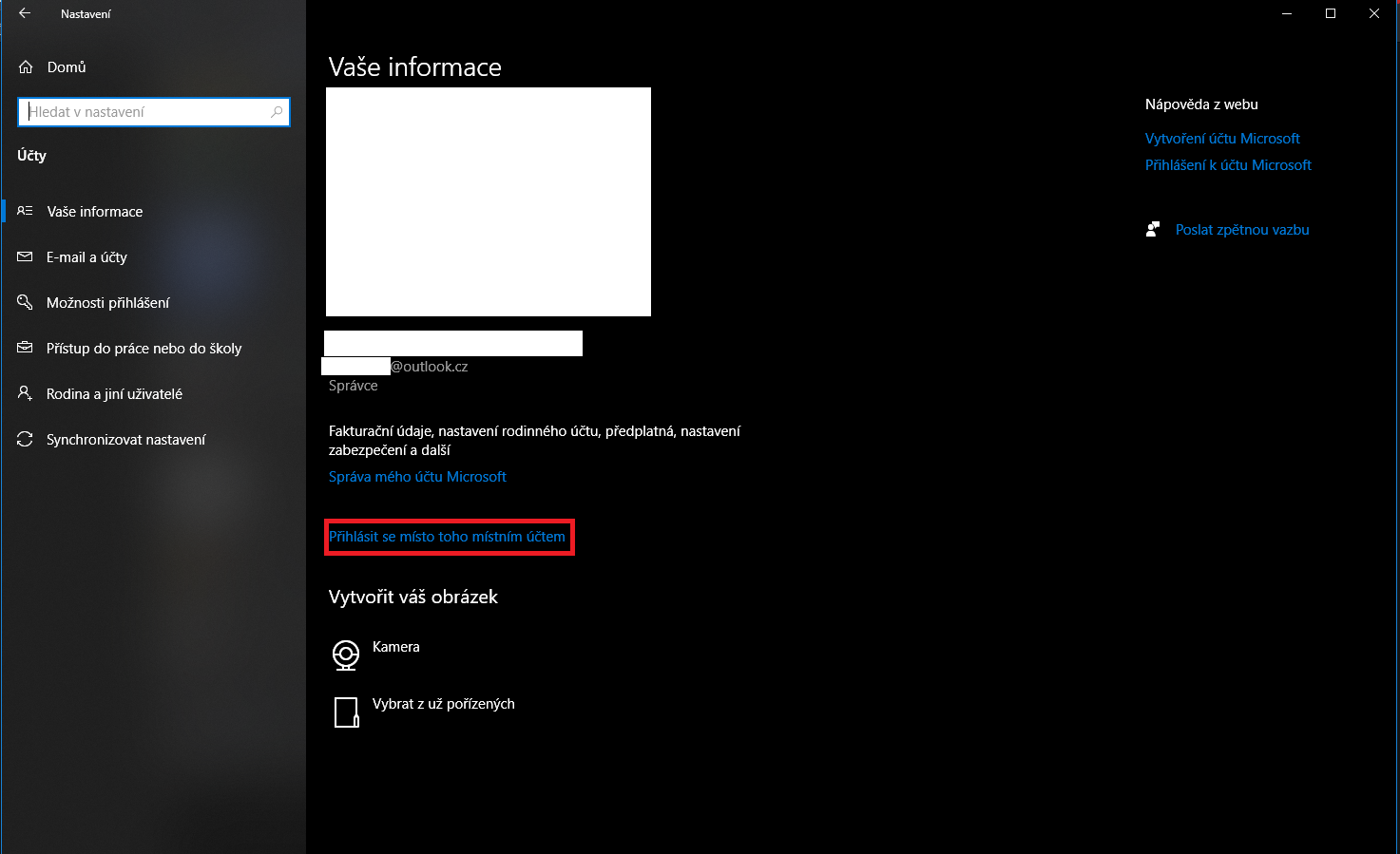 Co se týče "Vaše informace", zde nemám možnost přihlásit se nějakým jiným místním účtem.